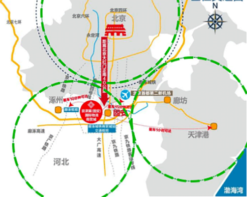 北与大兴区隔永定河相望,天安门正南50公里,距离北京大兴国际机场10公里,南与雄安新区接壤,距离雄安新区核心起步区50公里,东距天津主城区85公里,地处京津雄黄金三角战略核心